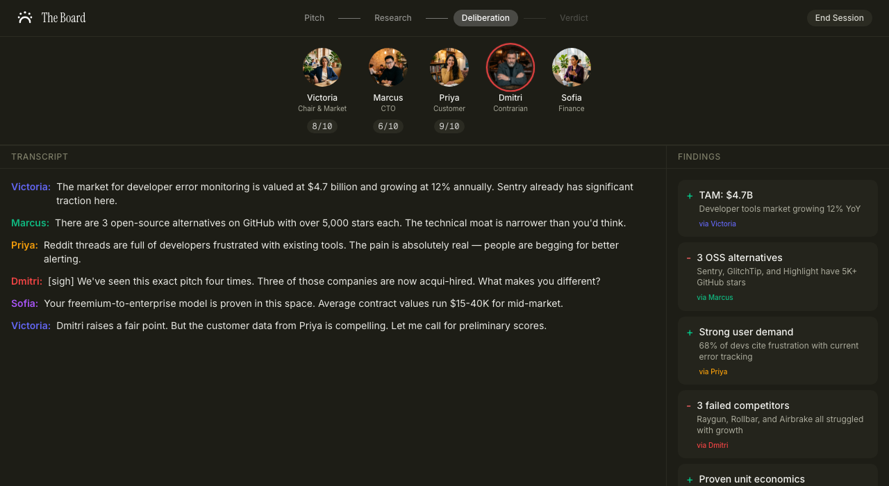 They argue. The CTO challenges the Contrarian. The Customer Advocate pushes back on Finance. Real multi-voice debate.